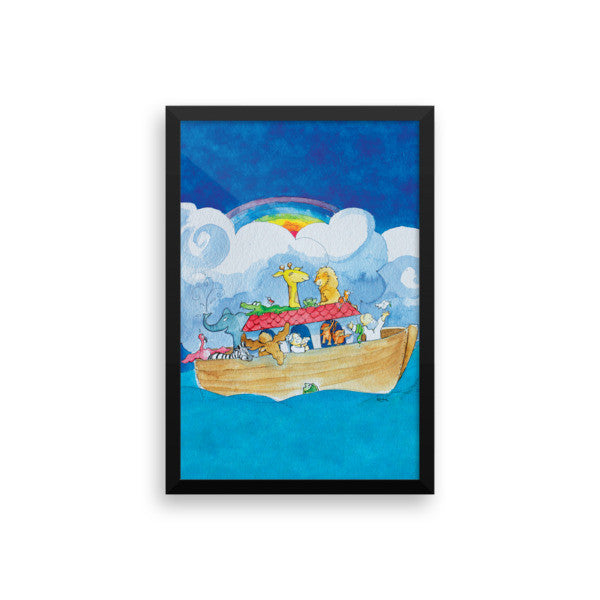Noahs ark in bright colors and whimsical animals, make a statement in any room. This framed poster printed on high quality paper, with a partly glossy, partly matte finish.